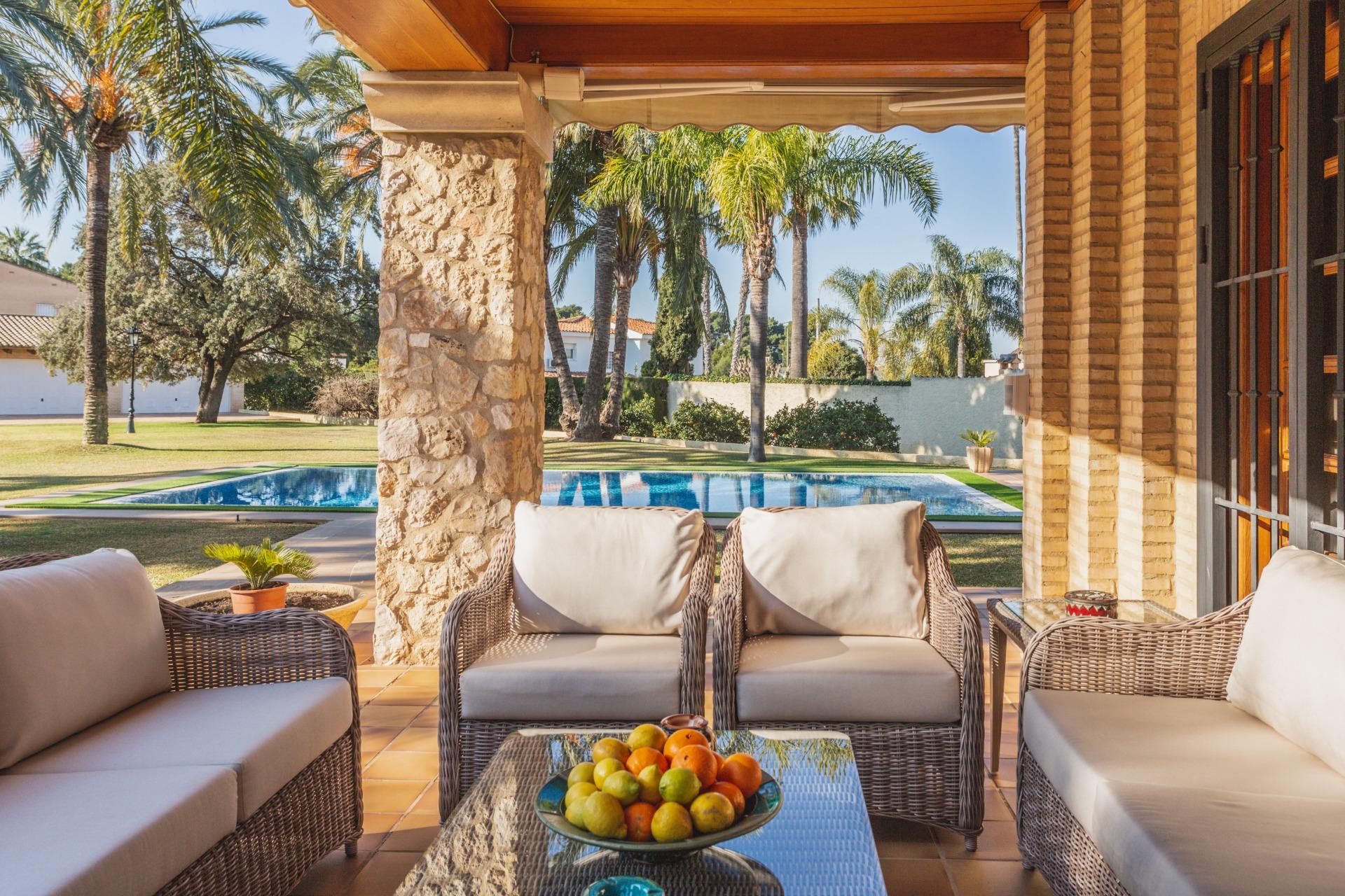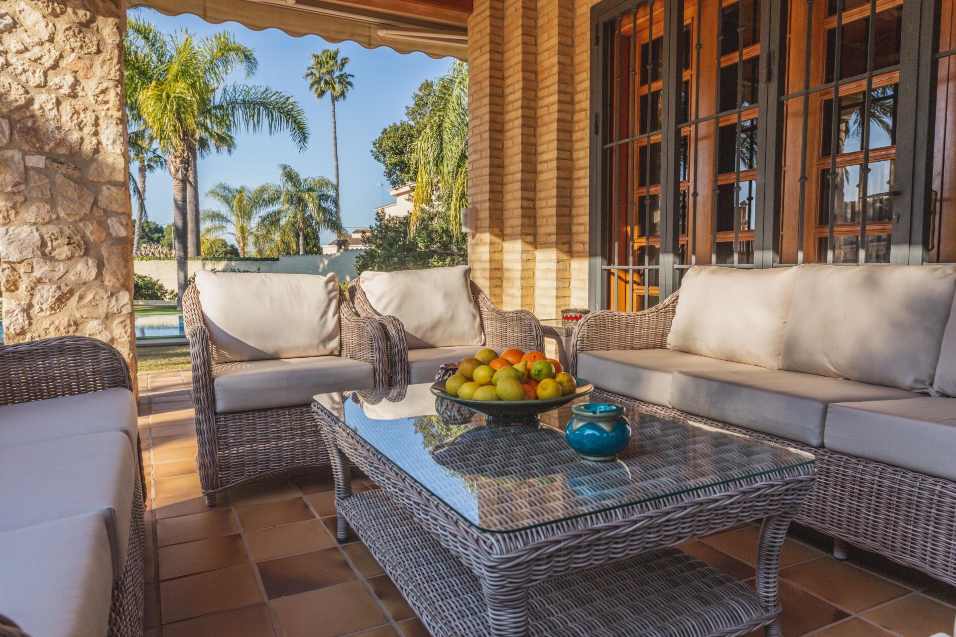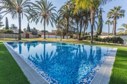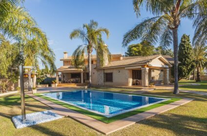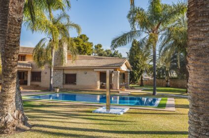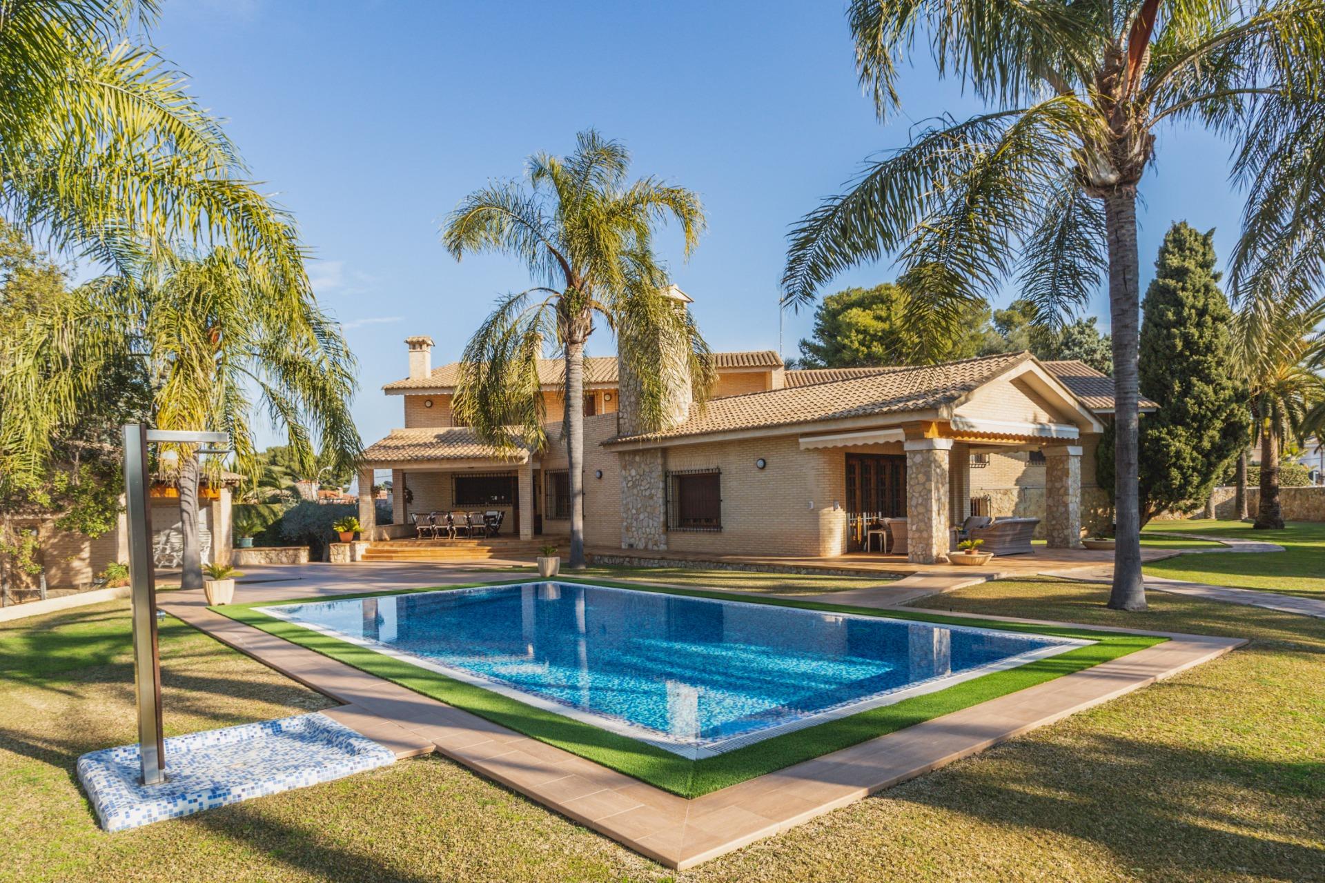 La casa está construida sobre una parcela de más de 3725m2, totalmente ajardinada con enormes palmeras y arbolado y con una preciosa piscina, zona de barbacoa , chill out, , zona de sauna y gimnasio, cuarto de máquinas para la depuradora de la piscina y el riego de toda la parcela, tendedero y todo lo que te puedas imaginar.
